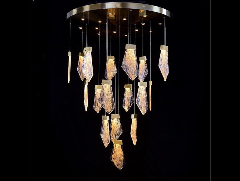 fixture showcasing eighteen angular cuts of seeded, mouth-blown glass that are