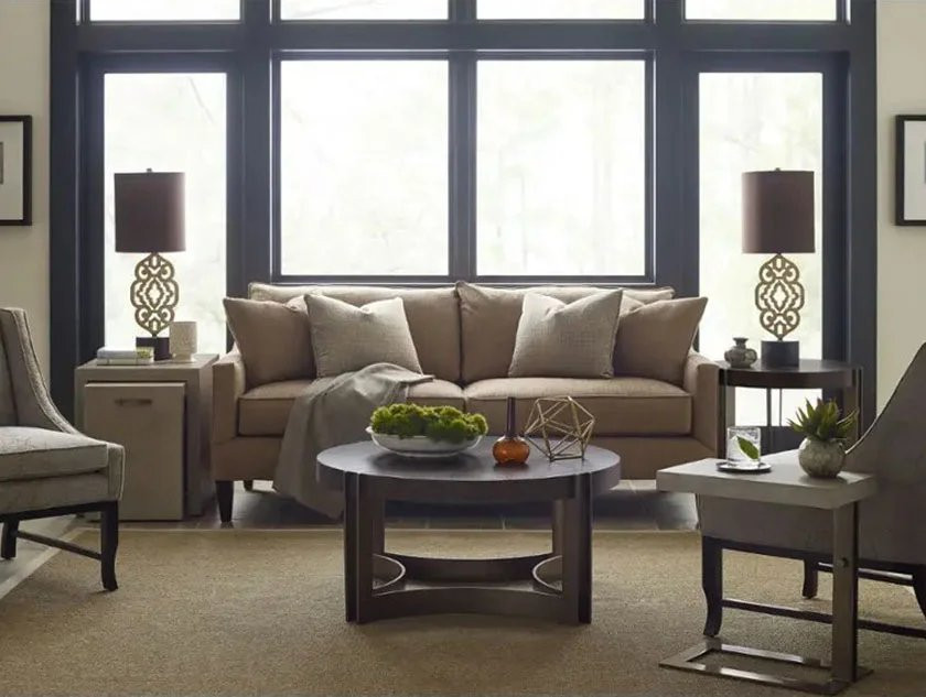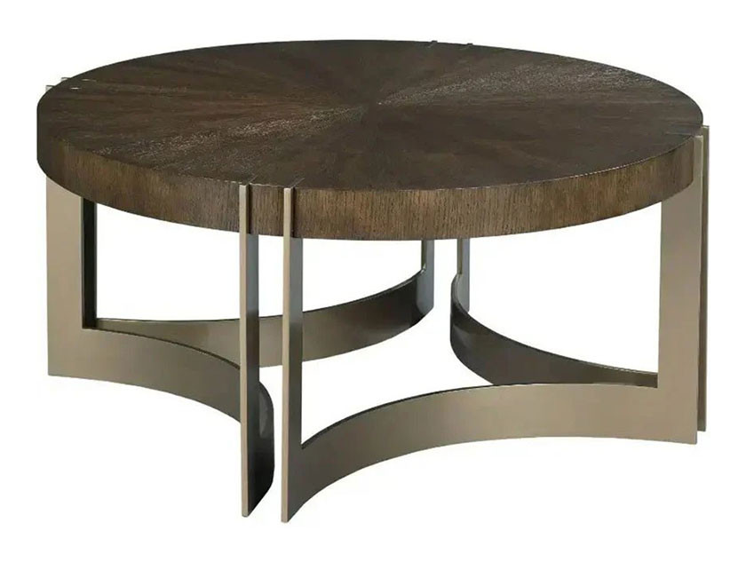 Kenton round cocktail table is perfect for the smaller setting with a dark stained white oak 38" veneer top and metal base.
